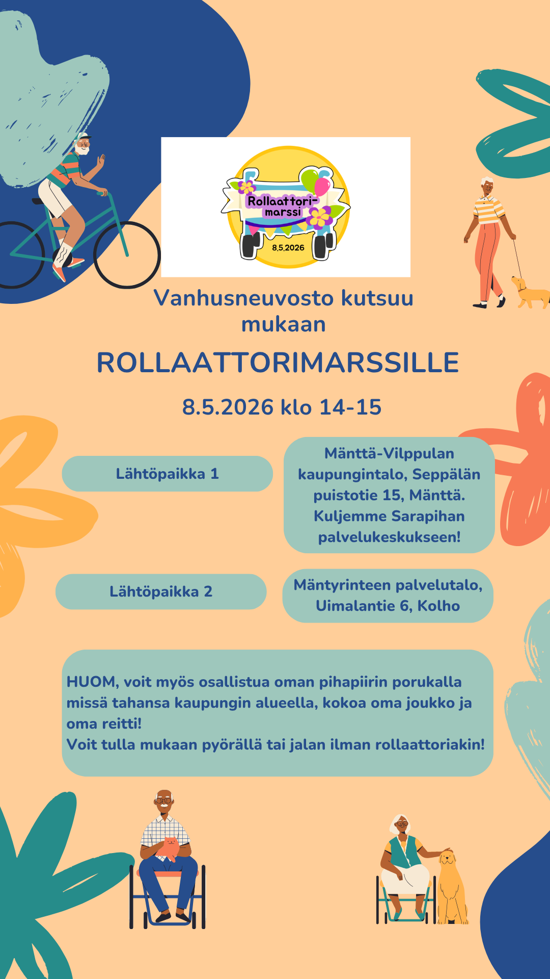 Vanhusneuvostomme kutsuu mukaan rollaattorimarssille 8.5. klo 14 alkaen. Mäntässä kokoonnumme Mänttä-Vilppulan kaupungintalolle, Seppälän puistotie 15…. Lue lisää27.04.2026 -