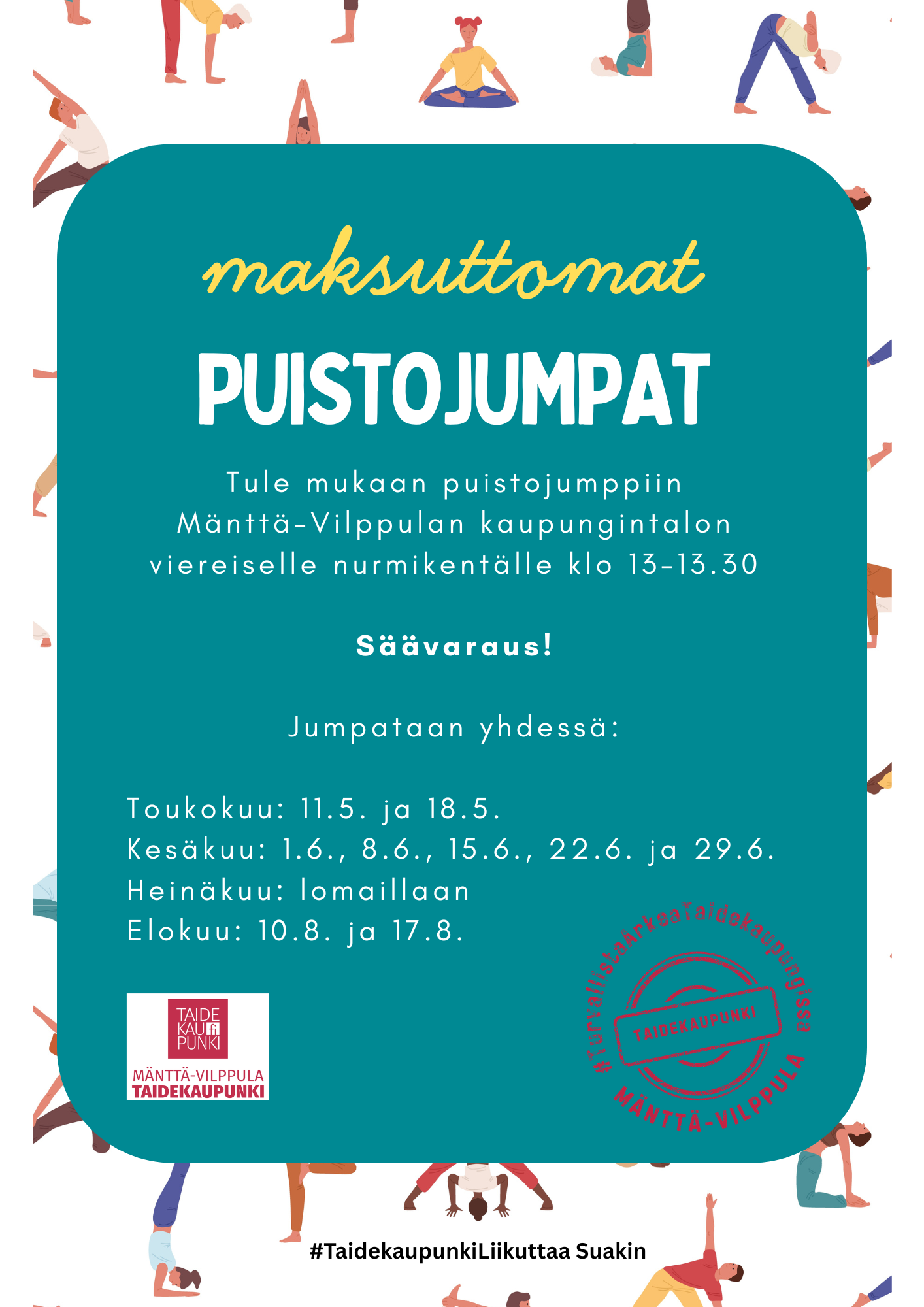 Nyt jo perinteeksi muodostuneet kaikille avoimet Puistojumpat alkavat toukokuussa! Aloitamme 11.5. klo 13-13.30 Mänttä-Vilppulan kaupungintalon… Lue lisää27.04.2026 -