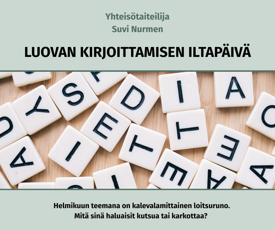 Mänttä-Vilppulan kaupungin yhteisötaiteilija, kirjailija-kuvataiteilija Suvi Nurmi kutsuu kaikentasoisia kirjoittajia mukaan kirjastoissa pidettäviin luovan kirjoittamisen iltapäiviin. Aluksi on yhteinen alustus ja opastus uuden, helposti omaksuttavan kirjoitusmenetelmän äärelle, ja loppuajan voi halutessaan käyttää oman tekstin työstämiseen. Helmikuun teemana on kalevalamittainen loitsuruno. Mitä sinä haluaisit kutsua tai karkottaa? Helmikuun iltapäivät: ▪ Mäntän kirjastossa ti 17.2. ▪ Vilppulan kirjastossa to 19.2. ▪ Kolhon kirjastossa ti 24.2. 🕙 klo 16-17.30 Luovan kirjoittamisen iltapäivät jatkuvat koko kevään ajan. Seuraa tiedotusta tulevista ajankohdista ja teemoista eri kirjastoissa!