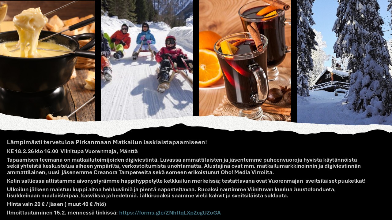 Tapaamisen teemana on matkailutoimijoiden digiviestintä. Luvassa ammattilaisten ja jäsentemme puheenvuoroja hyvistä käytännöistä sekä yhteistä keskustelua aiheen ympäriltä, verkostoitumista unohtamatta. Alustajina ovat mm. matkailumarkkinoinnin ja digiviestinnän ammattilainen, uusi jäsenemme Creanora Tampereelta sekä someen erikoistunut Oho! Media Virroilta.